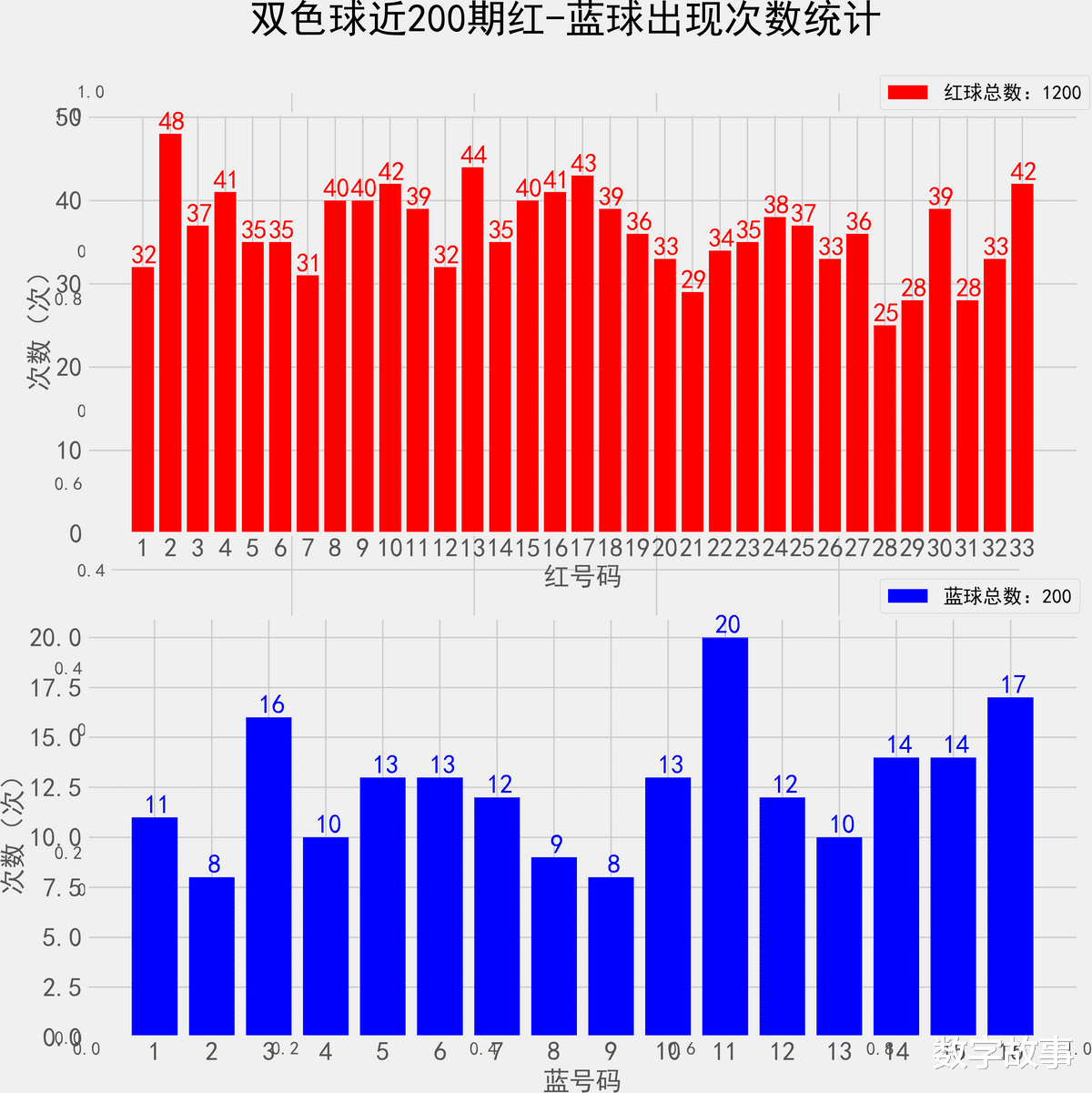 双色球近200期红蓝号统计情况统计样本数据: 1200个红球 200个蓝球