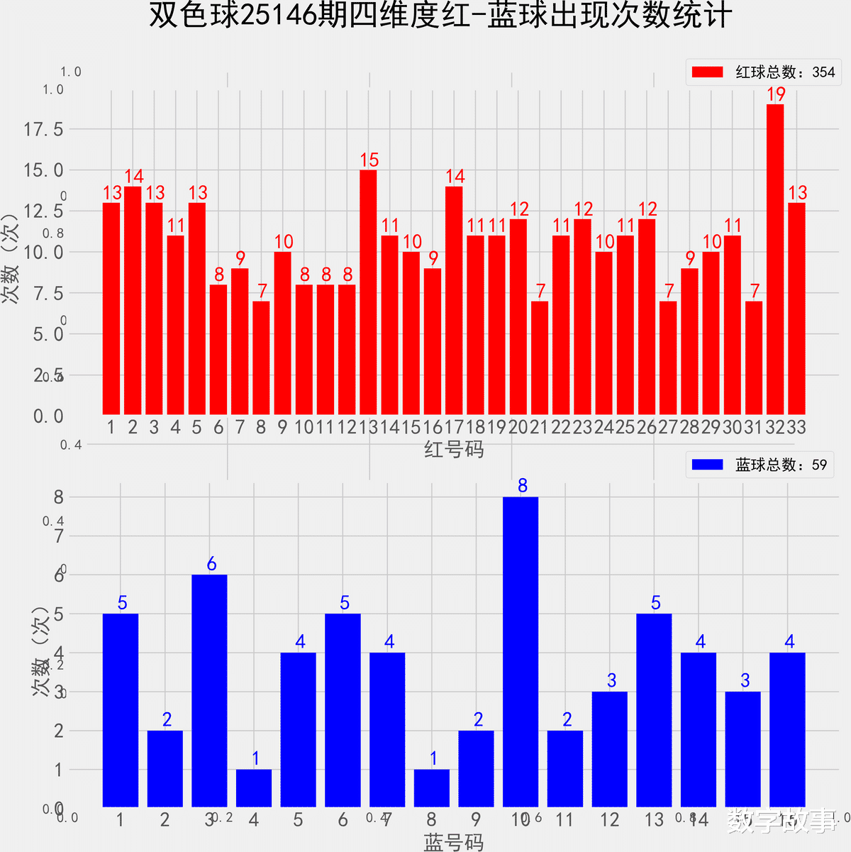 => 统计出现概率综合以上4个纬度的号码, 共59期根据出现的次数,分为热号,冷号,其他的为温号。统计样本数据:354个红球 59个蓝球