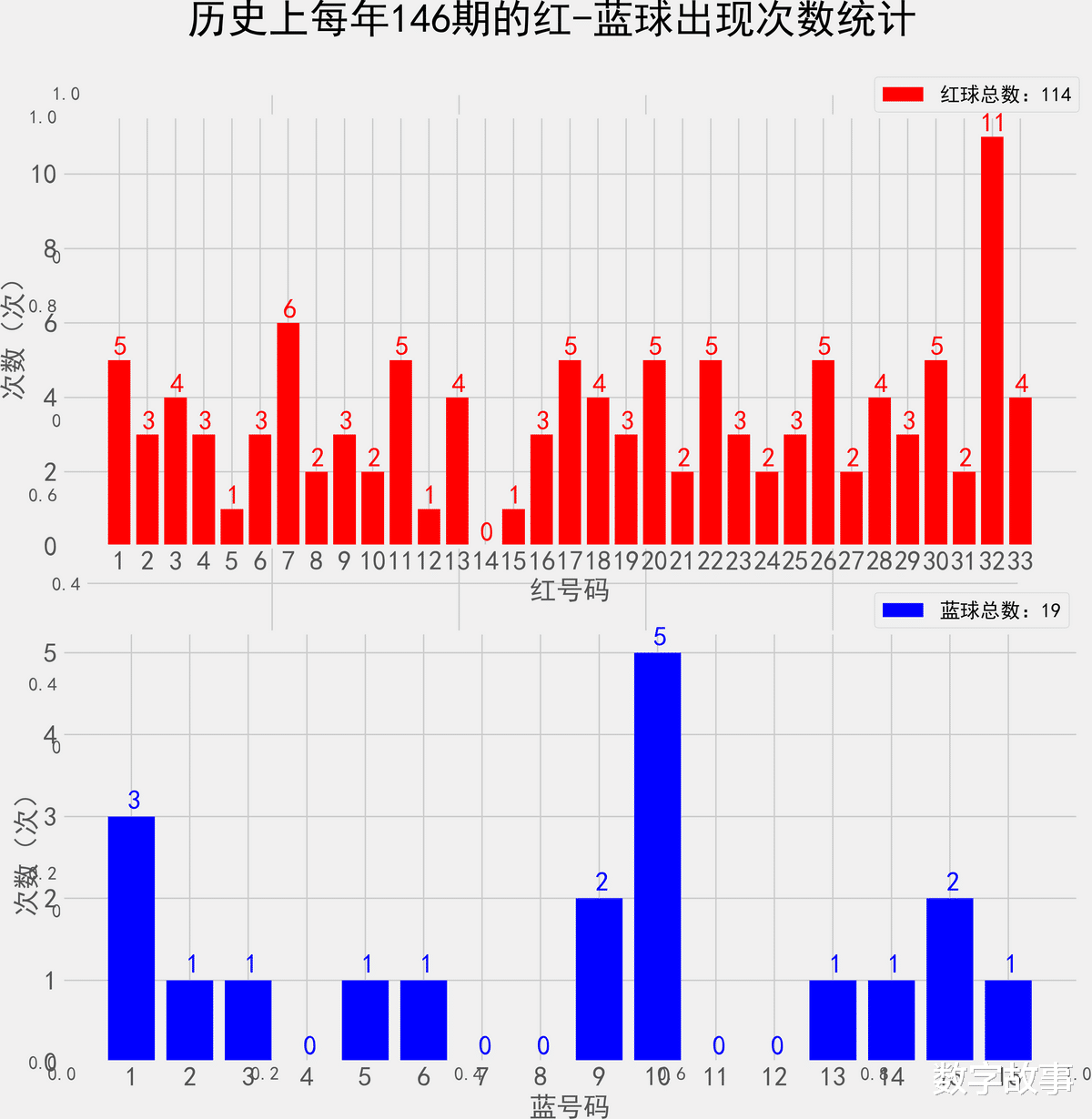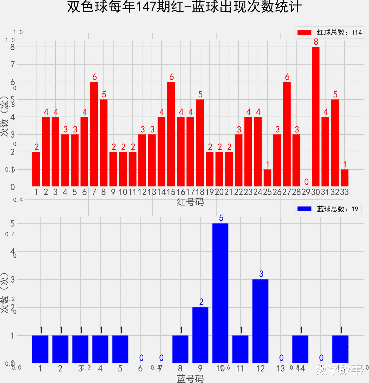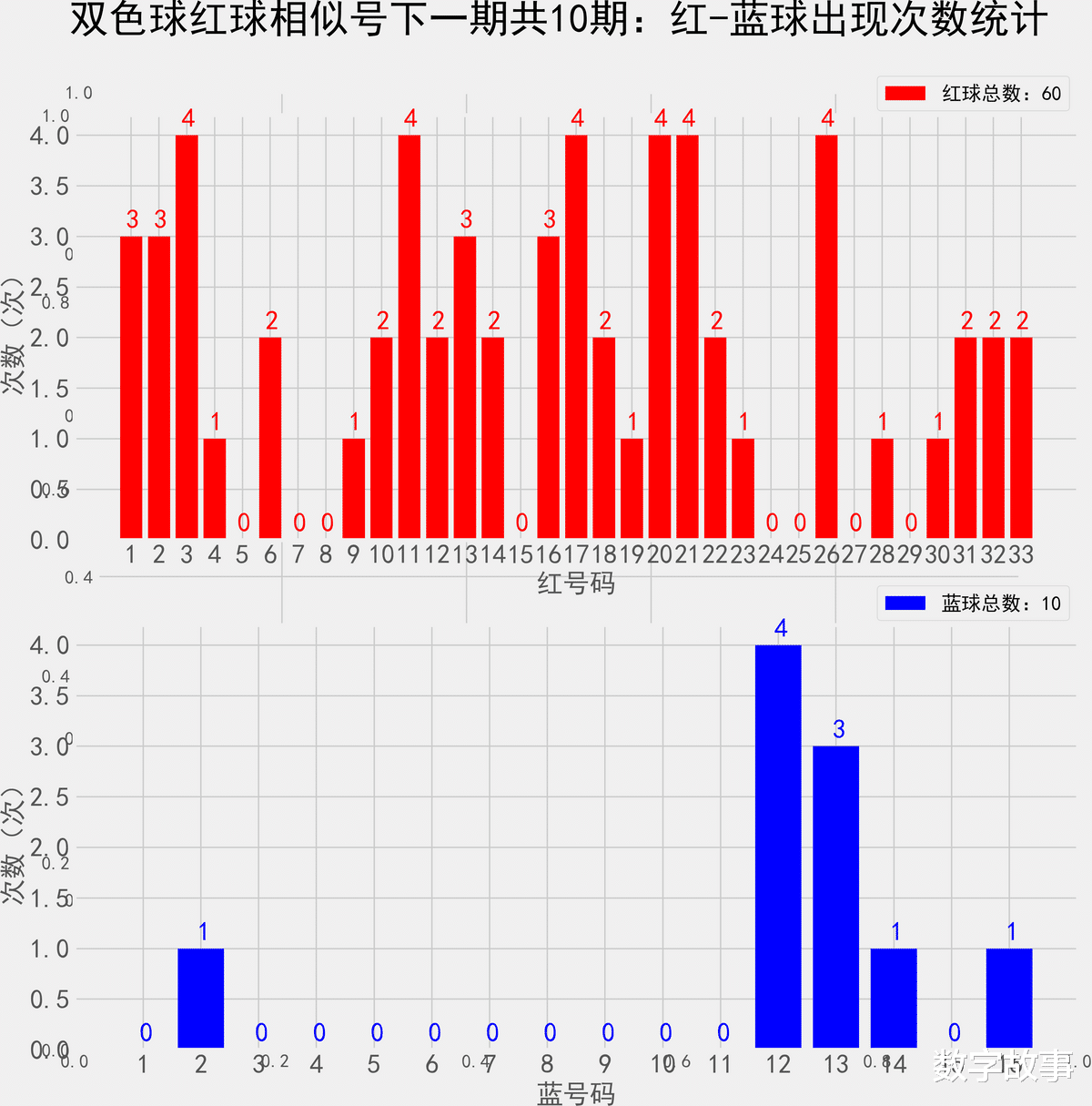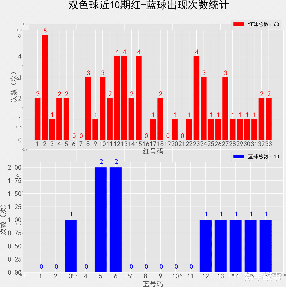 双色球近10期红蓝号统计情况统计样本数据: 60个红球 10个蓝球