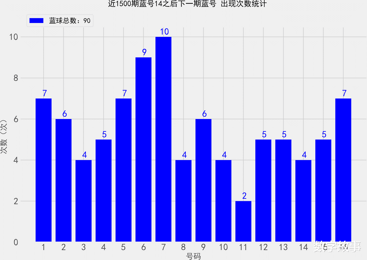统计近1500期蓝号14之后, 各蓝球的出现次数双色球25145期蓝号是14找出近1500期蓝球14号之后, 下一期出现的所有蓝号,统计其出现次数。,除开这一期,总共出现了90次14号球那么统计的样本数据是90个