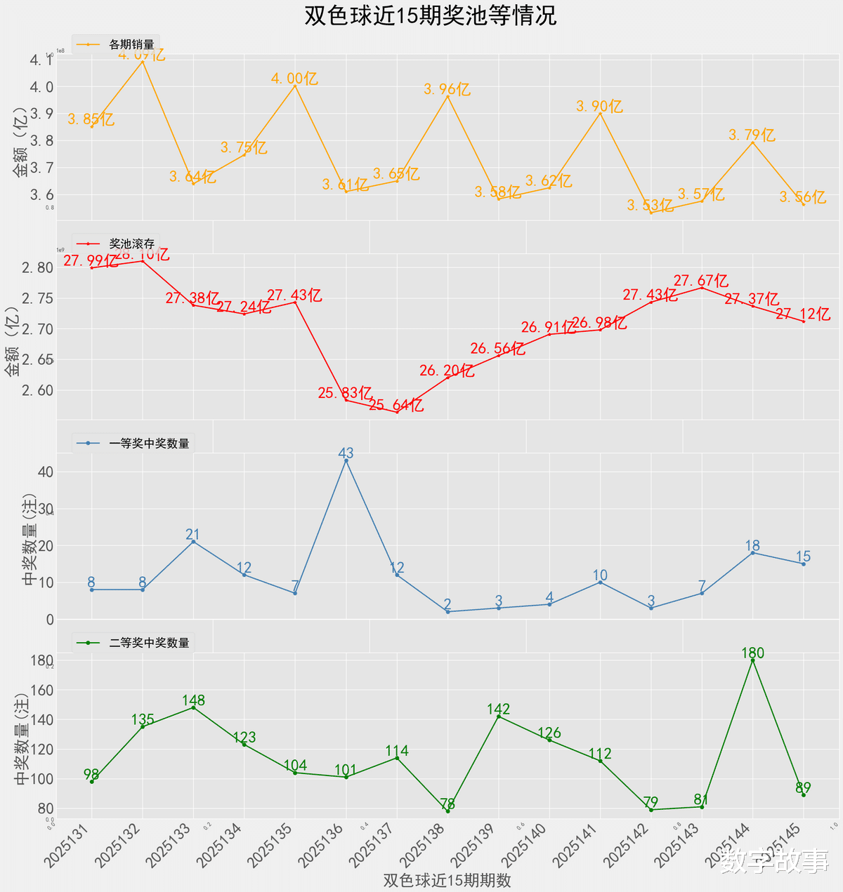 双色球25145期一等奖: 15注二等奖: 89注本期全国销售金额:356306424 元 奖池滚存:2711897665 元.近15期奖池滚存, 中奖情况等信息: