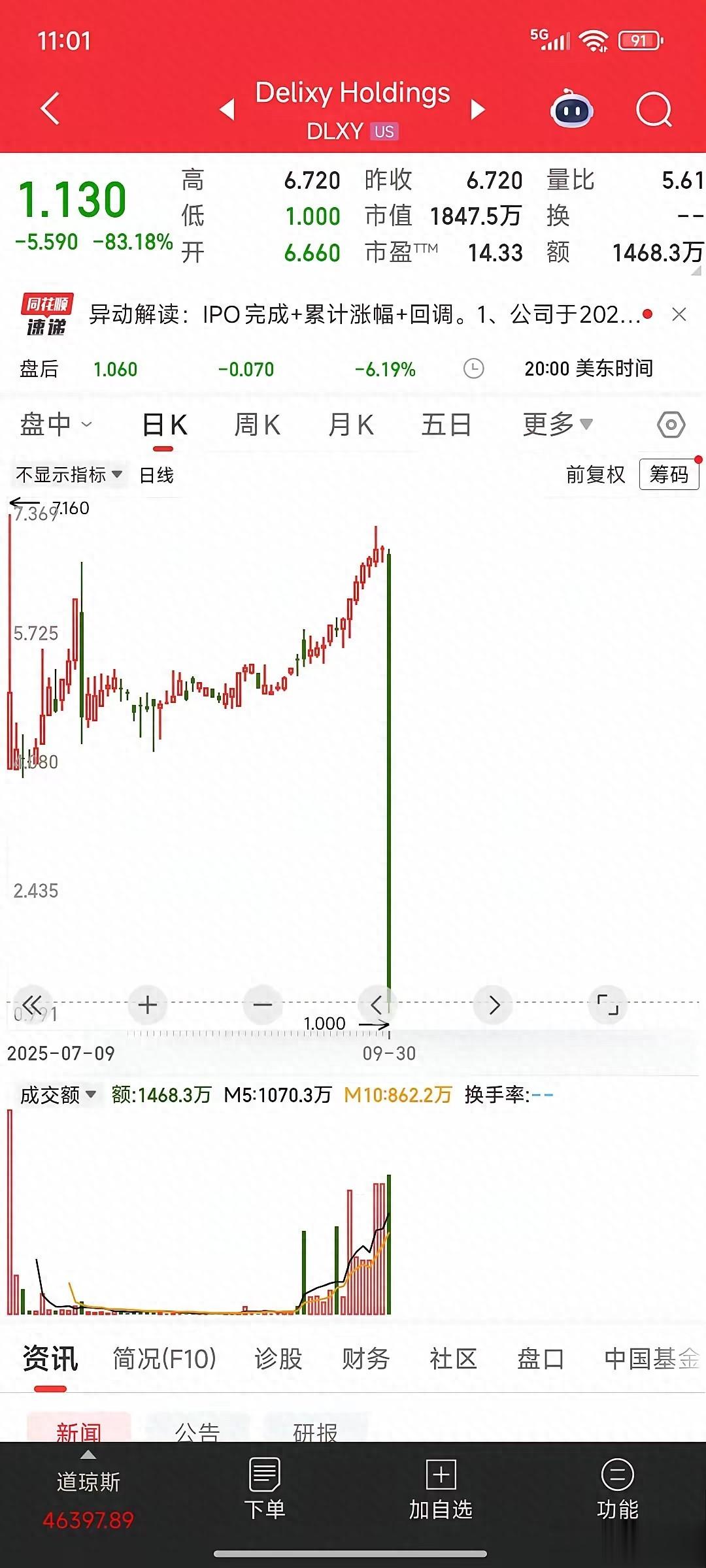 今天美股市场上,诞生了一只堪称最惨的股票。股价像坐了火箭,不过是往下冲。从六块多的高度,一头栽到一块多。跌幅超过百分之八十。整个过程快得让人反应不过来,这就是传说中的闪崩。