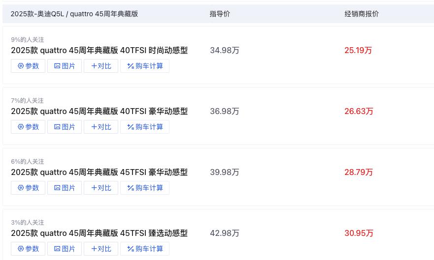 价格战!可以说是最近两年国内汽车市场的局势,即便是奔驰这样的加价提车的豪华汽车品牌,最近两年也不得不低下高傲的头颅,价格一跌再跌,至于奥迪、宝马就更不用说了,比如说奥迪Q5L,作为一台豪华中型SUV,其厂商指导价格为34.98万-42.98万,曾经也有过加价选装的情况,即便是最低配,也要40万出头。