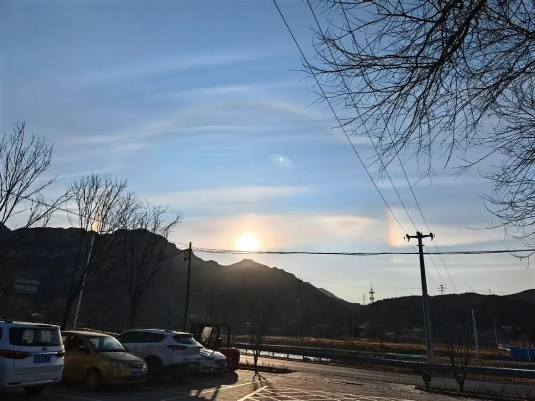 正好今年元旦当天下午,我有个朋友就在北京门头沟偶然碰到了绝美的日晕,巨大的彩虹光环穿插在山间。