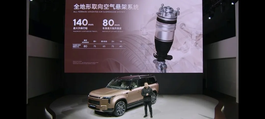 硬件方面,全地形取向空气悬架可提供140mm的最大升降行程,使其最大涉水深度达到了770mm,前双叉臂+后H臂多连杆独立悬架,配合天纳克HRS液压缓冲+威巴克底盘衬套,可以大幅提升底盘冲击时的稳定性和舒适性。