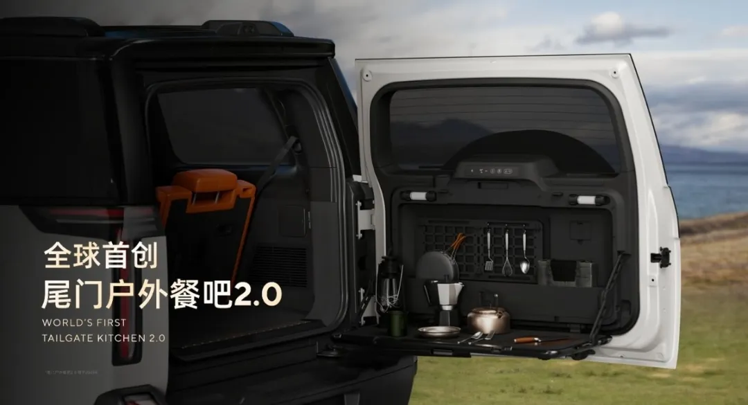 比如5.7kW的外放电能力,配合布局更加合理的“尾门户外餐吧2.0”,以及斜坡车身一键调平功能,已经从以往的“应急厨房”升级为了“专业厨房”。