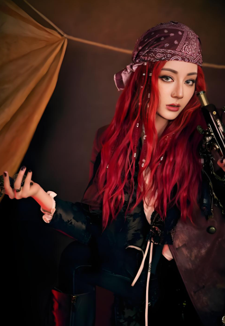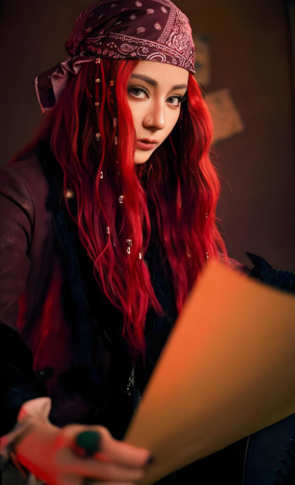 而最让人眼前一亮的,当属她那一头红发。热烈似火的红发在灯光下闪耀着独特的光芒,与黑色皮衣形成鲜明又大胆的色彩对比。红发肆意地散落在她的肩头,为她原本就精致的脸庞增添了几分妩媚与撩人。她的眼神中透着自信与张扬,红发随风飘动,仿佛在诉说着她的不羁与自由。