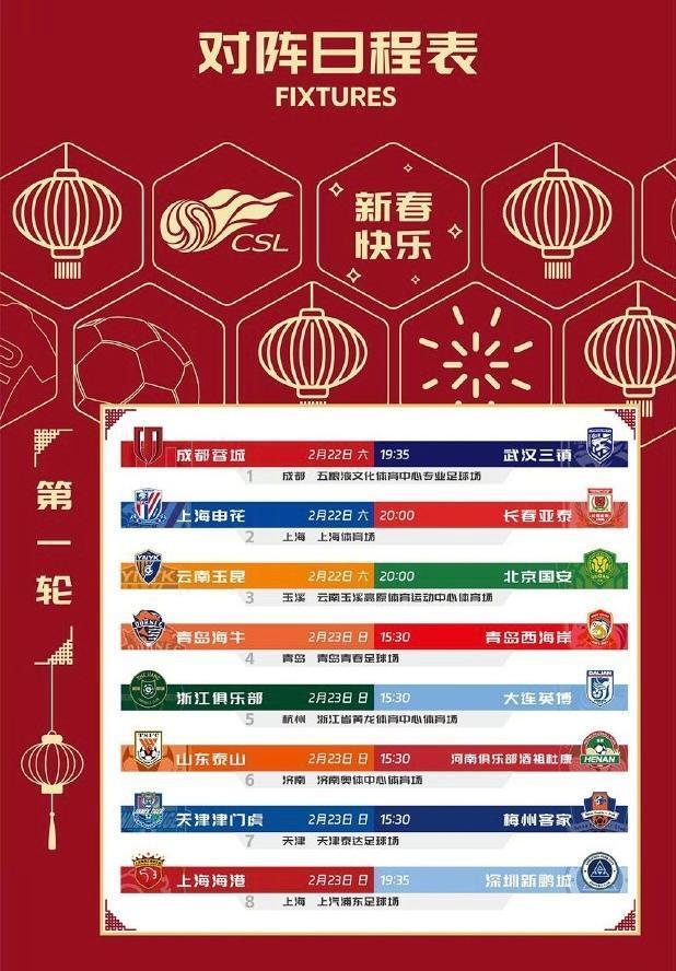 2 月 22 日,首轮比赛的大幕拉开。成都蓉城主场对阵武汉三镇,这场比赛注定充满激情与火药味,19 点 35 分,蓉城的球迷们将会在主场严阵以待,准备为主队呐喊助威。而开幕式则放在了上海申花与长春亚泰的比赛之前,20 点整,当开幕式的灯光闪耀,那将是整个中超联赛的精彩序曲。与此同时,云南玉昆的高原主场首次亮相中超,他们将迎战北京国安。国安首战就要奔赴遥远的客场,这无疑是一场艰难的挑战,但也正是这样的困难,让比赛充满了不确定性和看点。