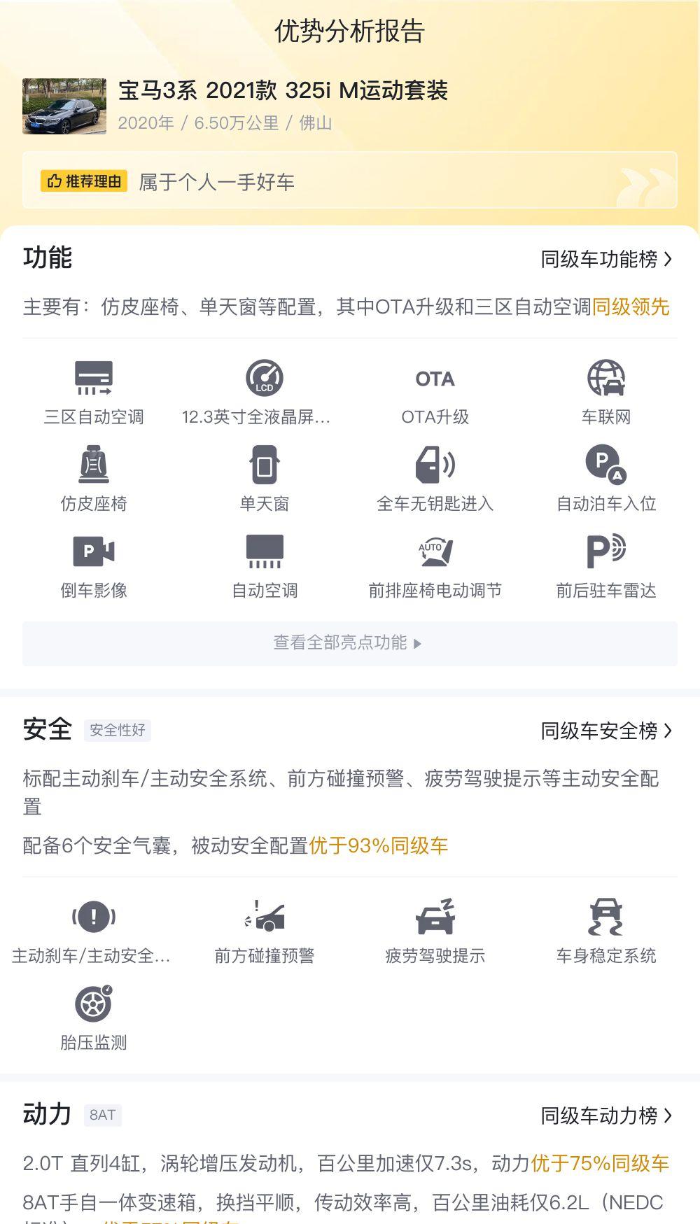 动力方面,这辆325i搭载的是2.0T涡轮增压发动机,最大功率135kW,最大扭矩300N·m,匹配8AT变速箱。账面数据看起来不错,但实际表现如何呢?6.5万公里的行驶里程,发动机和变速箱的工况是否依然保持最佳状态?这需要试驾才能知道。别光听卖家吹嘘“动力强劲”,要自己亲自感受。