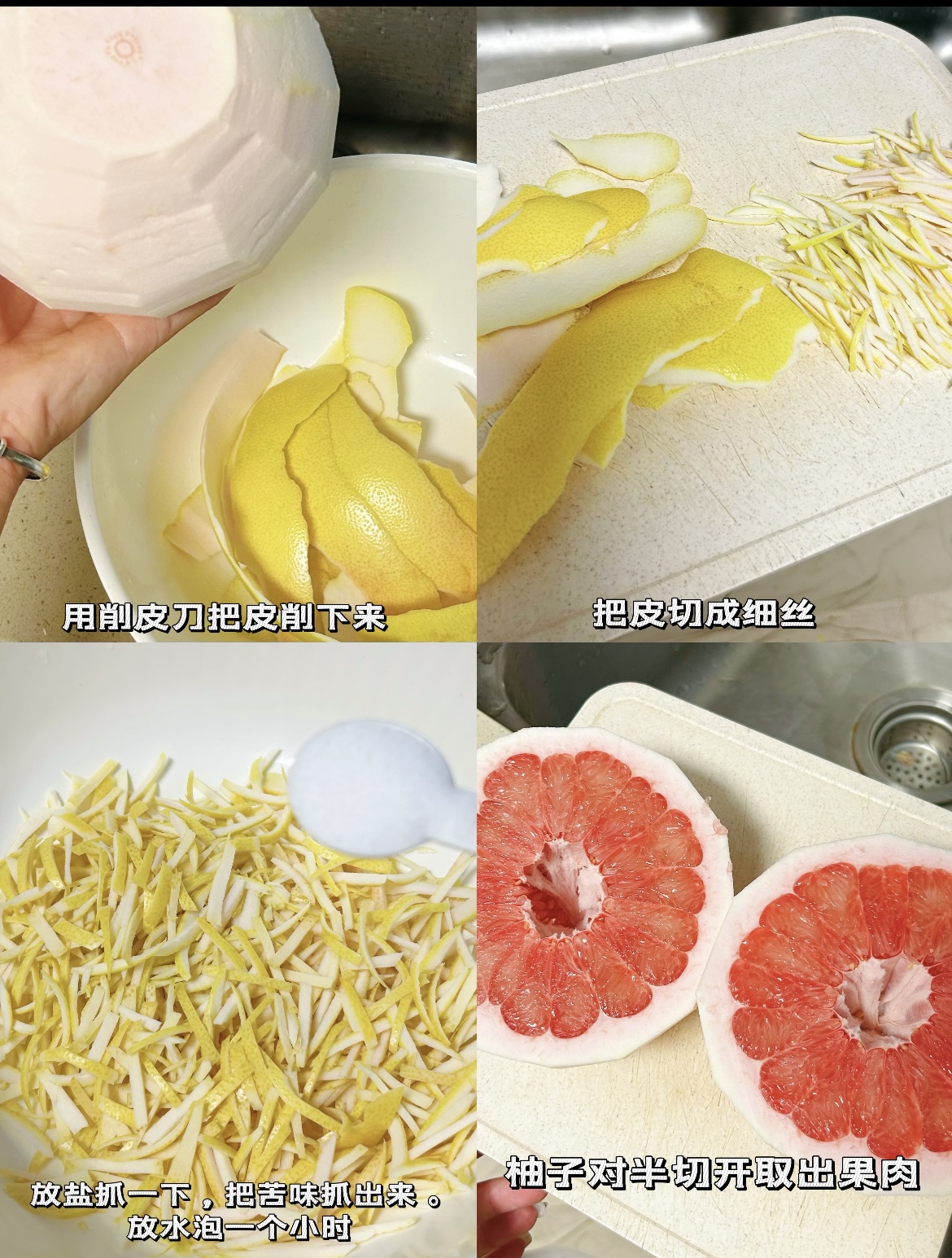接下来,就是制作过程。首先,将柚子用盐水搓洗干净,去除表面的蜡质和杂质。然后,将柚子皮削下来,尽量只取黄色的表皮部分,白色的部分要尽量剔除干净,因为白色部分含有较多的苦味物质。将削下的柚子皮切成细丝,放入清水中浸泡,期间多次换水,以进一步去除苦味。