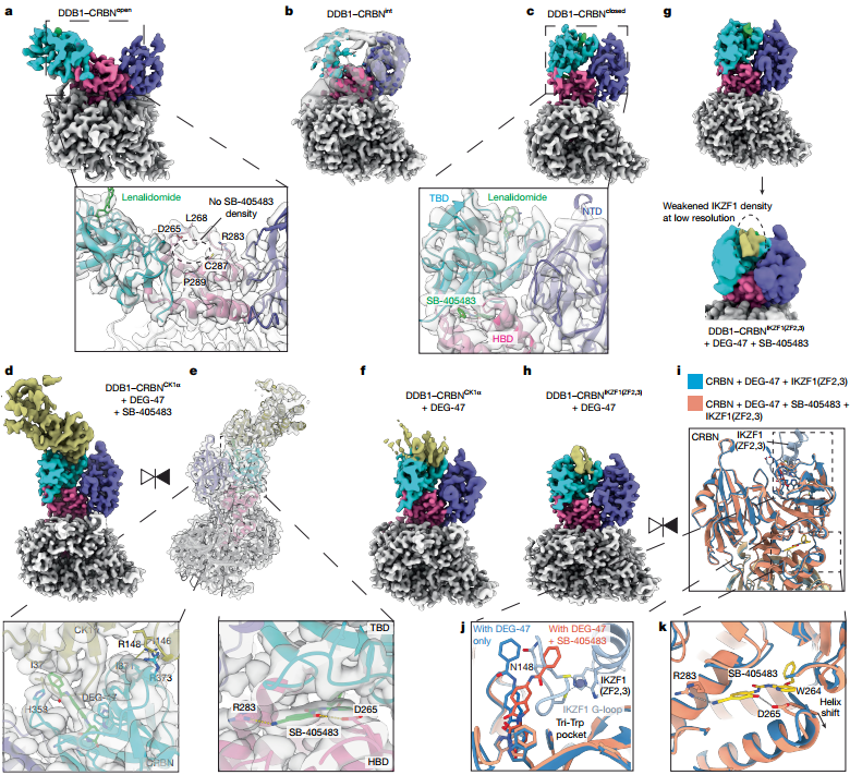 通过冷冻电镜技术,研究人员捕捉到了SB-405483如何改变CRBN的构象动态。关键发现是:SB-405483主要结合并稳定CRBN的闭合构象,促使蛋白构象平衡从“开放”向“闭合”状态移动。从而选择性增强了偏好闭合态的底物(如CK1α)的招募,同时抑制了偏好开放态或其他构象的底物(如IKZF1)的招募。