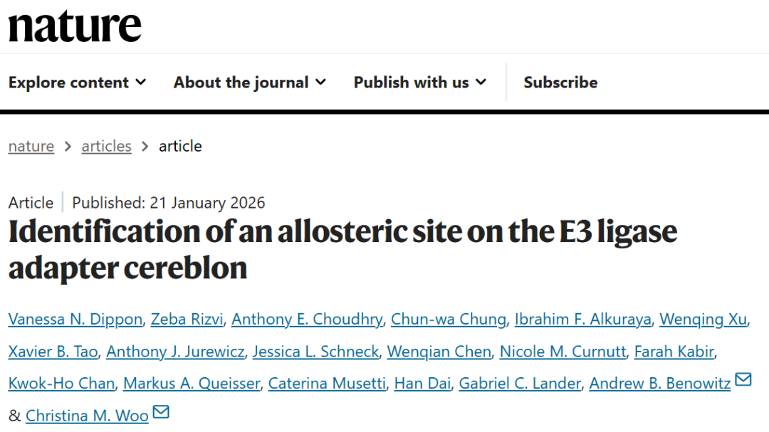 相关研究以“Identification of an allosteric site on the E3 ligase adapter cereblon”为题,于2026年1月26日在线发表于《Nature》上。