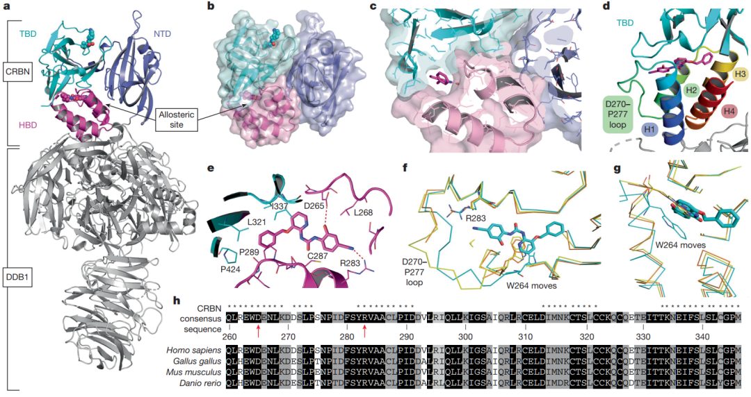 图2. 人CRBN–DDB1与变构SB-405483化合物和来那度胺的晶体结构