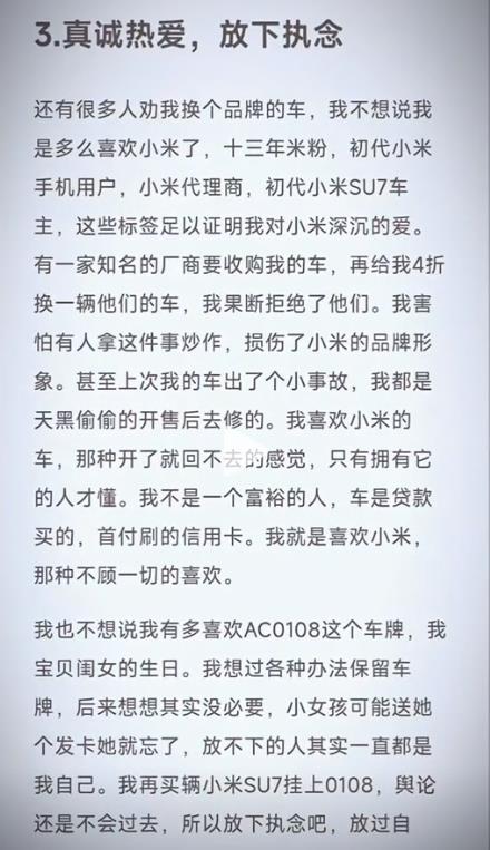 他表示自己是这个品牌的代理商,还是这个品牌的车以及手机初代用户,深爱这个品牌多年,他不想让这个品牌成为大家的舆论话题。