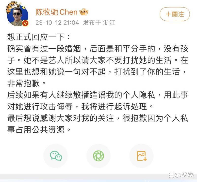 对于被爆有过一次婚姻记录,陈牧驰10月12日在微博发文,承认过去确实有过一段婚姻,但双方是和平分手,也没有小孩,“她不是艺人,所以请大家不要打扰她的生活。”对于引发争议,他也向前妻道歉:“对不起,打扰到了妳的生活,非常抱歉。”