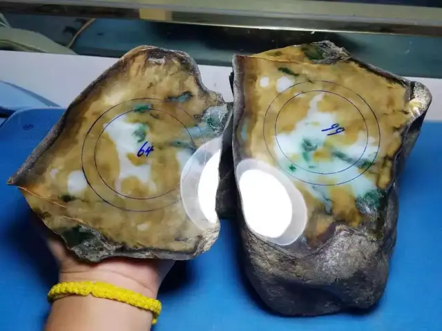 原石一分为二,呈现出三种不同的色彩,黄翡的外层加上白绿相间的里子,确实是块难得一见的好料,这时的货主早就激动不已,想必这是切涨了吧,但能涨多少还得靠技巧呢!