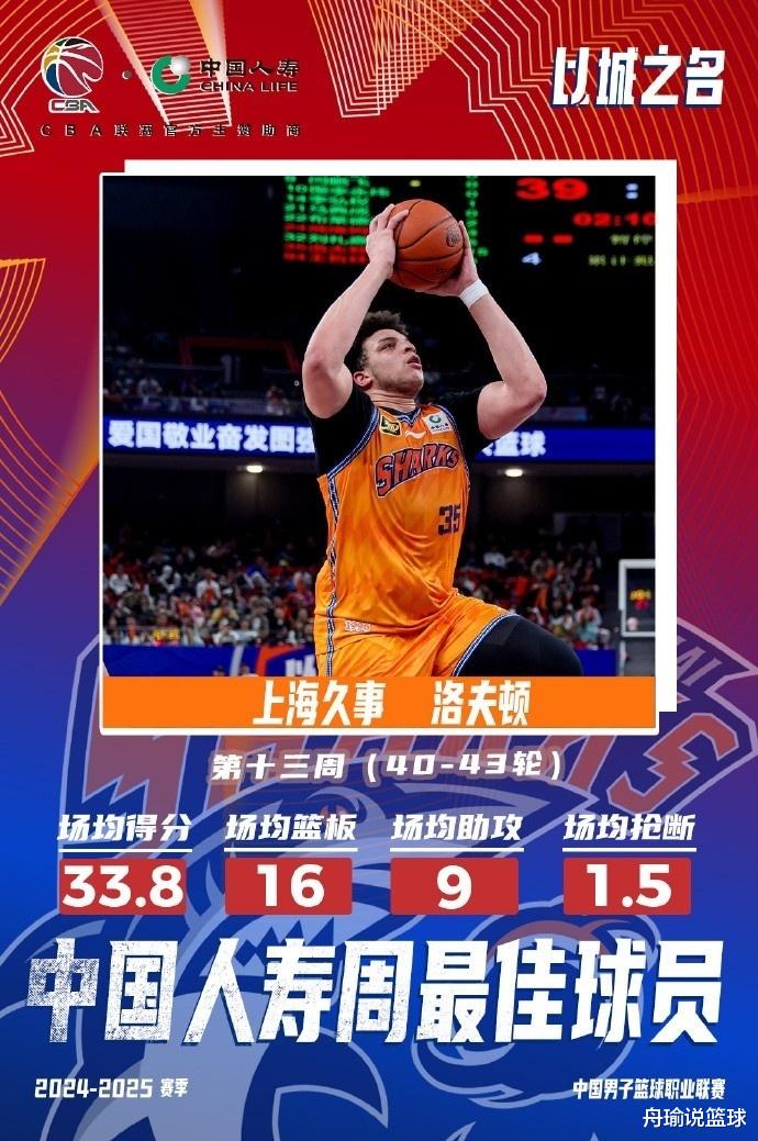 CBA官方宣布,洛夫顿当选2024-2025赛季CBA联赛常规赛第十三周最佳外援。