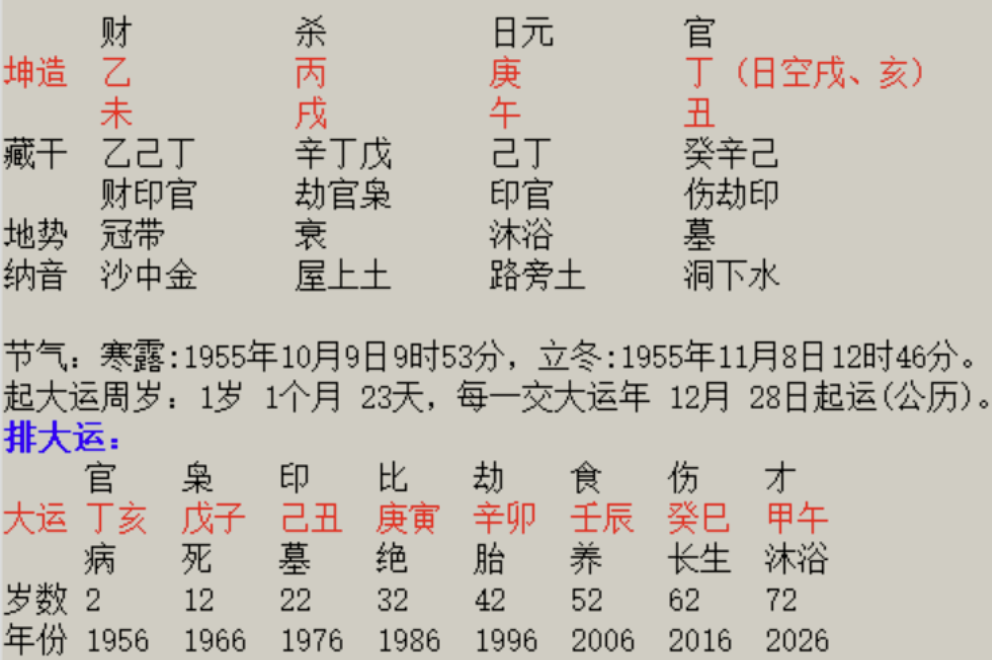 原局透干乙丙丁,木火一片,日主贴身丙午丁煅金,且乙木坐未土库、丙火坐戌土库,未戌刑开库,木火连绵不绝,这对于庚金来说,既是压力也是机遇。