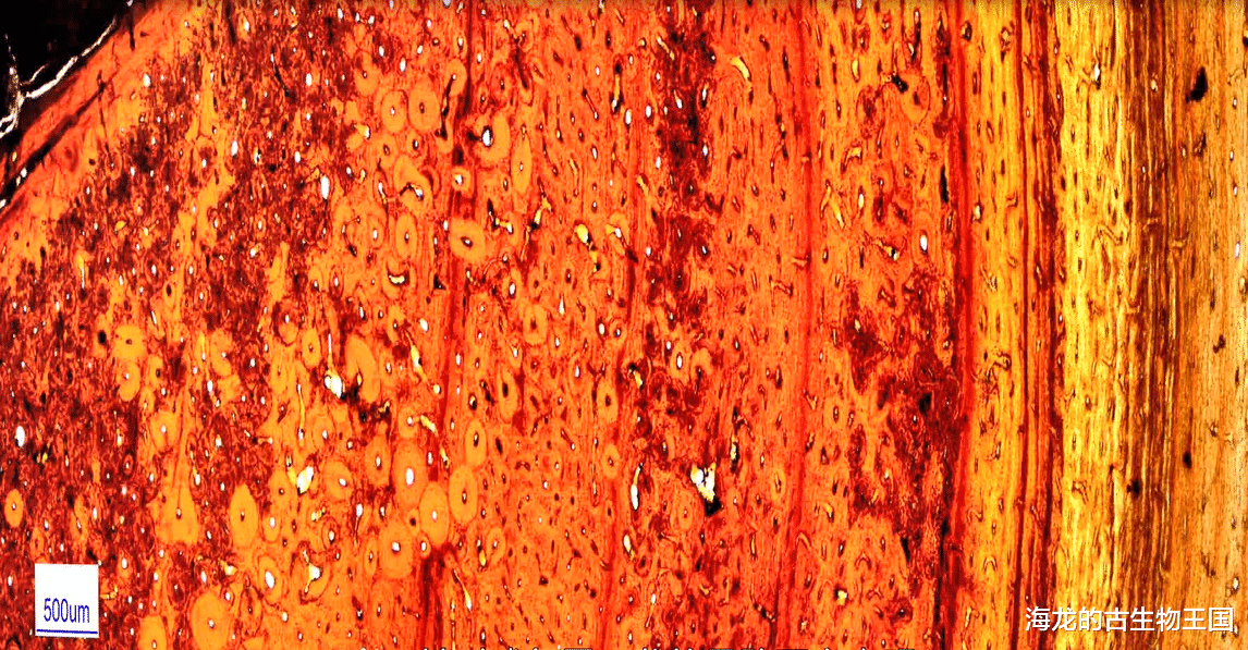 当一只动物逐渐长大,成长速度也变缓,日渐发育成熟。这些沉积下来的年轮线间距就会逐渐变密,针对成年霸王龙的骨头研究表明霸王龙能活到30岁,那么简有多少岁呢?通过年轮线,我们得出结论简至少有11岁,如果它是一只霸王龙,那就意味着它依旧还很年轻,还可以继续成长。