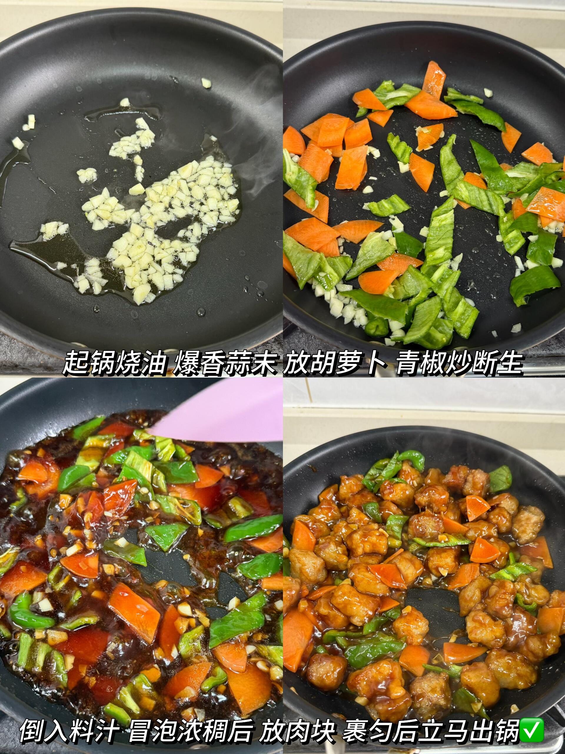 开始炒制时,留少许底油爆香蒜末,放青红椒和胡萝卜片翻炒到断生——这一步要大火快炒,保持蔬菜的脆嫩。倒入调好的酱汁,煮到冒大泡、略微浓稠时,立刻倒入炸好的肉段,快速翻炒让每块肉都裹满酱汁——动作要快,避免肉段回软。撒点鸡精提鲜(可不加),翻炒均匀就能关火啦!如果喜欢更浓郁的口感,可以撒点芝麻或葱花增香。