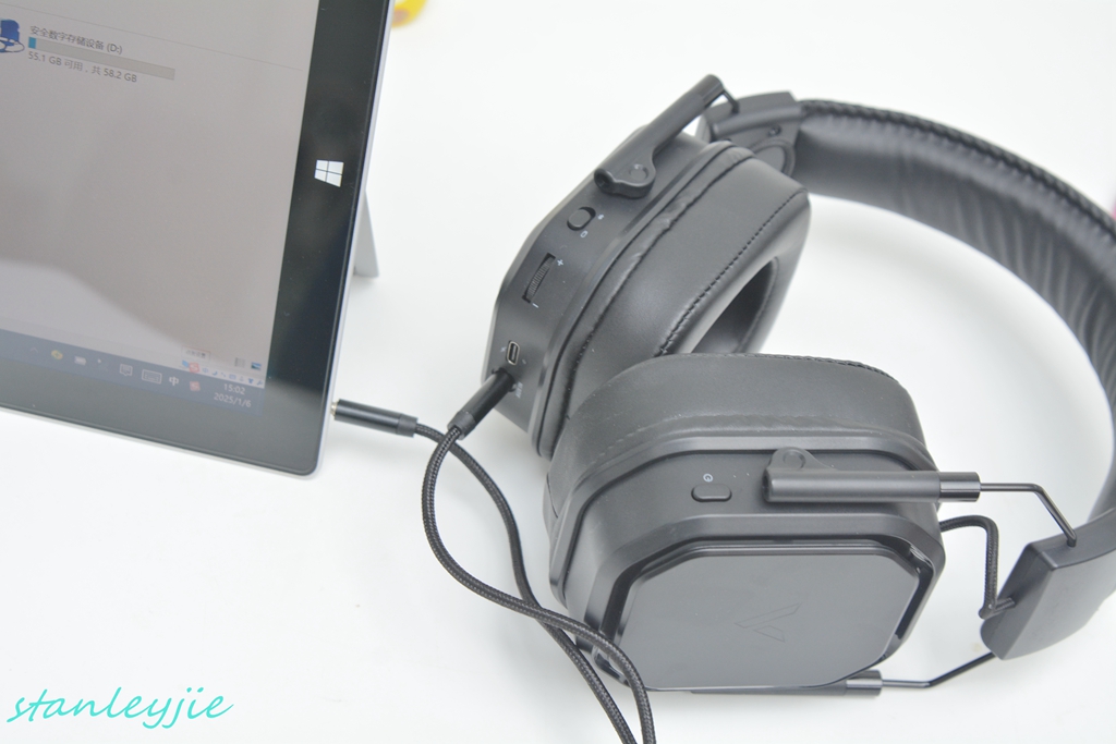 重量。这是一个无线耳机,内置了1200mAh的锂电池,再加上厚耳罩等用料带来的份量后,耳机的重量在319g,算是中等重,戴在头上略有点压头感,不过可以接受,
