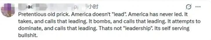 不过相比于这位网友,下位网友的回复则更为尖锐,他毫不客气的在评论区指出,美国从未领导过任何国家,它只会占领、只会掠夺、只会试图对它们进行支配,若把这样的行为称之为领导,在他看来简直就是一种自私自利的“胡扯”。