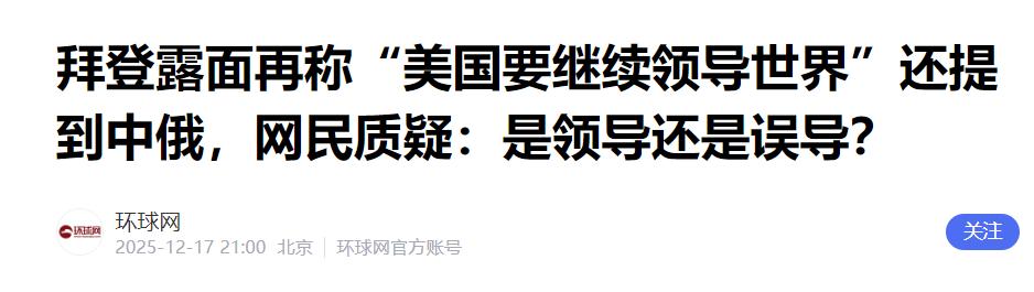 而这位已有八十三岁高龄的拜登还有着相当充分的诡辩理由,他表示,世界需要美国领导,如果美国不选择领导世界,美国难不成要把世界的领导权交给中国?交给俄罗斯?