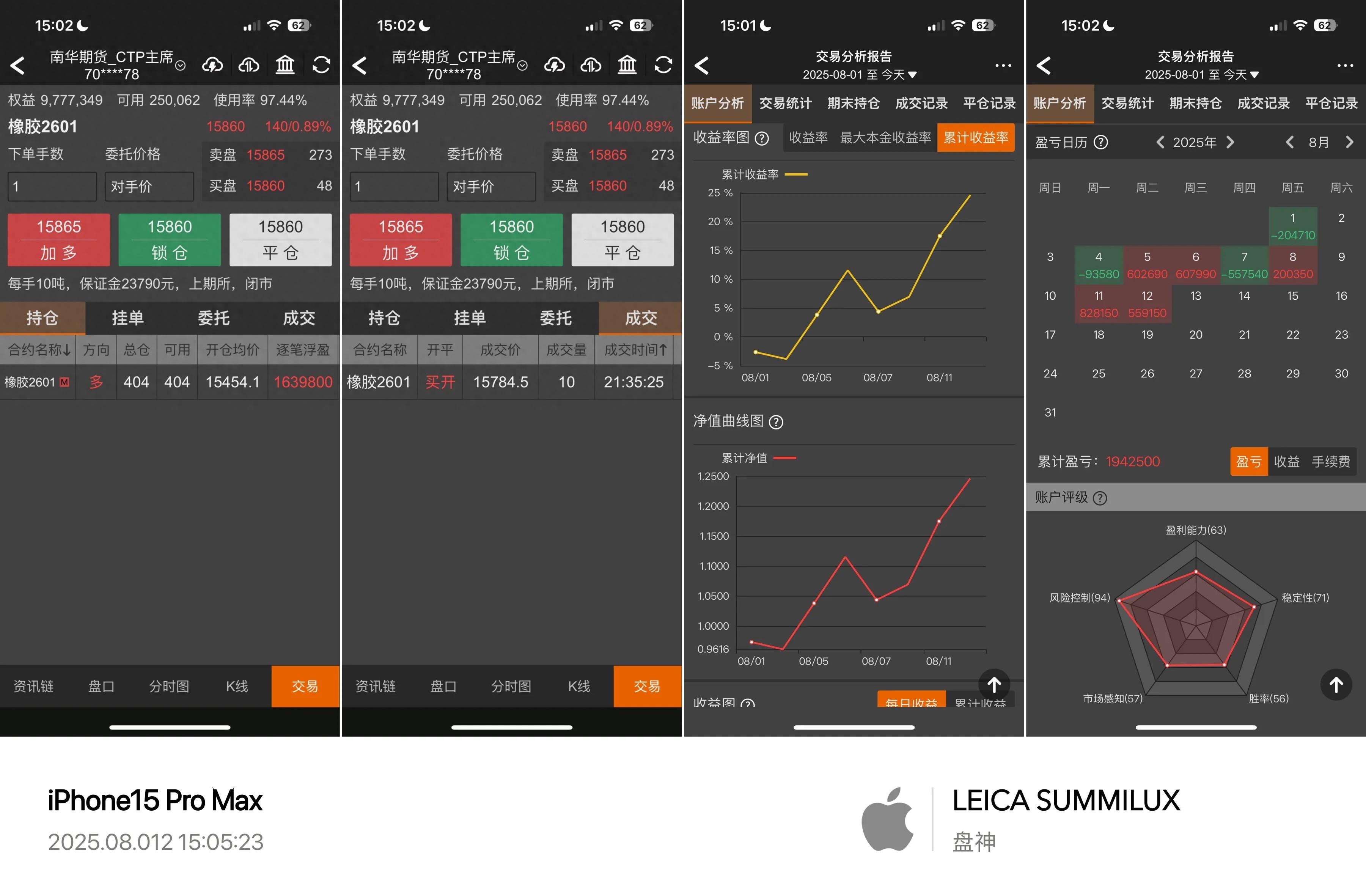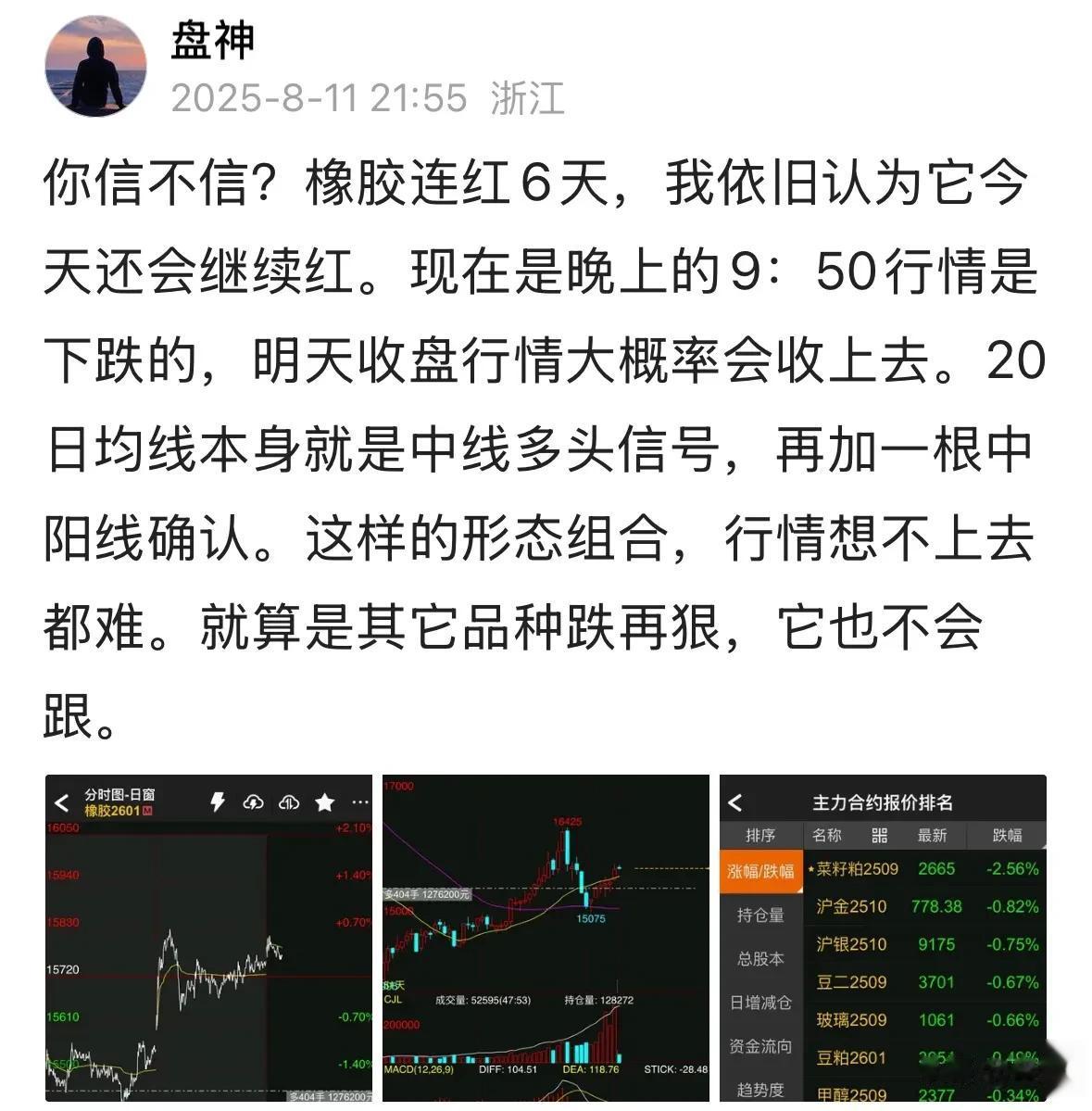今天的市场非常火爆,整体多头情绪十分强烈,焦煤暴涨都破新高了,其它暴涨的品种也比比皆是。而我依旧岿然不动没有怎么操作,加了10手橡胶。最近过于自信了,应该收敛一下。千不该万不该,不应该在盘中去预测行情,昨天夜盘就做了很愚蠢的事。虽然尾盘橡胶拉起来证明我是对的,但是行为上已经离谱了。以后不会再盘中去发具体品种方向了,太飘了,引以为戒。
