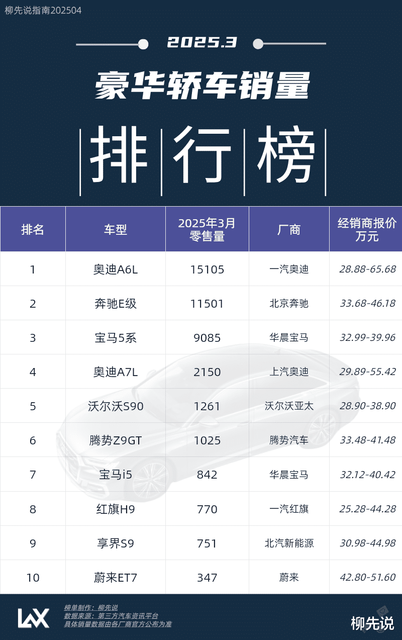 2025年3月豪华轿车销量1-5名:奥迪A6L、奔驰E级、宝马5系、奥迪A7L以及沃尔沃S90,前三甲零售量分别为15105辆、11501辆和9085辆。位居榜首的奥迪A6L,在需求端,它完美契合商务精英对体面座驾的刚性需求,宽敞的后排空间和沉稳大气的设计成为商务接待的标准答案。在市场策略上,有着相比竞品更大幅度的终端优惠。