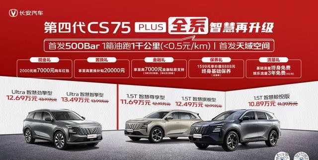 长安CS75 PLUS是一款紧凑型SUV,目前有五款车型参与限时促销活动。这些车型的原价范围在11.39万到13.99万之间,现在优惠后的价格降到了10.89万至13.49万。购车时,消费者可以使用2000元的红包抵扣7000元的车款。除此之外,还有多种优惠:最高20000元的置换补贴,最高7000元的贷款利息补贴,以及1599元即可享受价值8888元的终身基础保养服务。此外,车辆还提供基础流量永久免费和每月4G的娱乐流量,免费期限为三年。