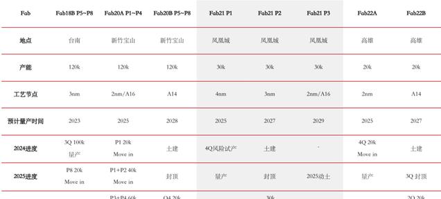 Fab21 P2还处于土建阶段,2024年建设进度不及预期,判断与《芯片法案》补贴协议最终的签署进度有关。按原计划,2025年封顶,随后进入洁净室、厂务设施的安装阶段,到2026年年底开始移机试产,2027年第三季度开始量产3nm芯片。