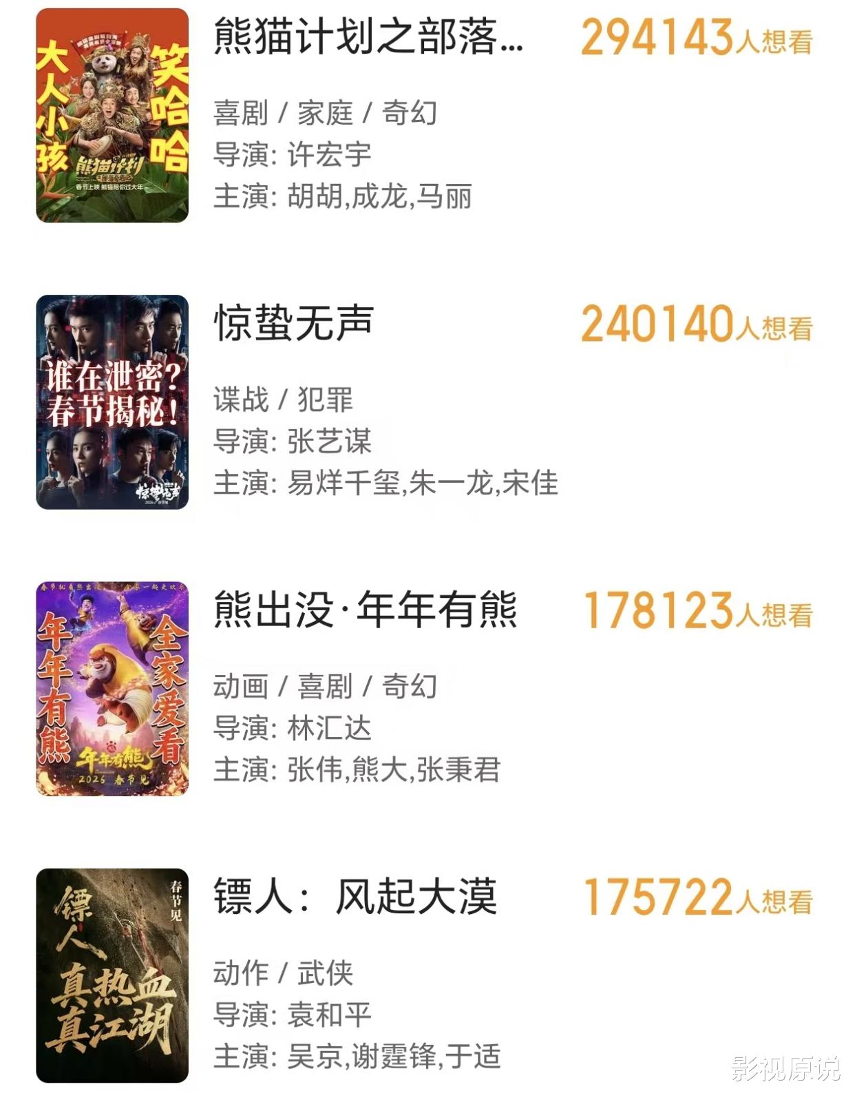 这也就是说,今年春节档六部新片中,真正的票房竞争者就只有五部,分别是《飞驰人生3》《镖人》《惊蛰无声》《熊出没之年年有熊》和《熊猫计划2》。这里的《飞驰人生3》和《镖人》是档期冠军的最大热门,它们都有可能会笑到最后。