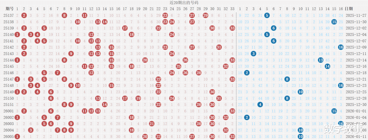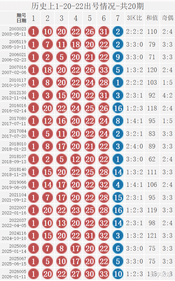 双色球2026005期红号在过去是否出现过?双色球2026005期红号: 1-20-22-27-30-33经查,历史上没有出现过与这一期6个红球或者5个红球号码一样的。与这一期4个红号一样的有17期,如下: