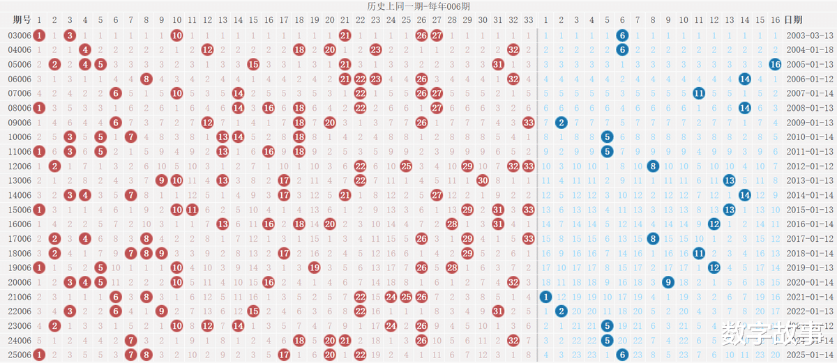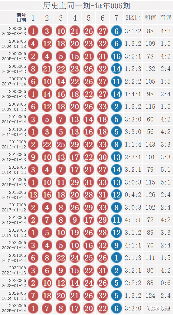 博弈心理,挑战概率: 看近期开奖号码,也可看历史数据统计!【双色球26006期多角度冷热号】双色球26006期四维走势图,红蓝号统计及冷热号1) 历史同一天: 01月13日 (共8期)