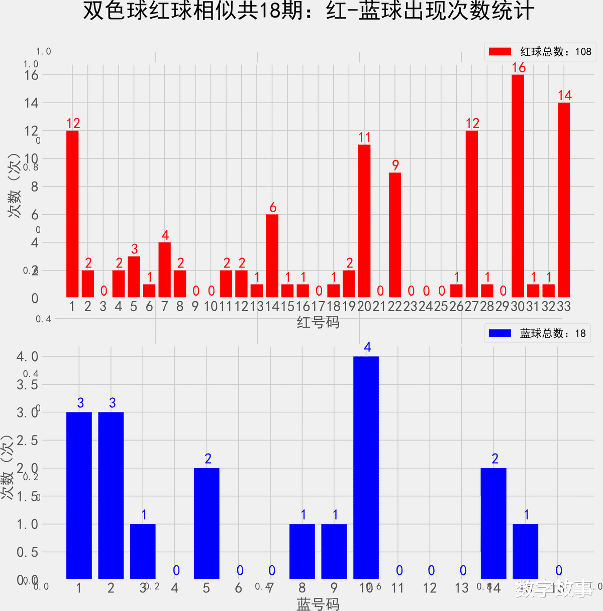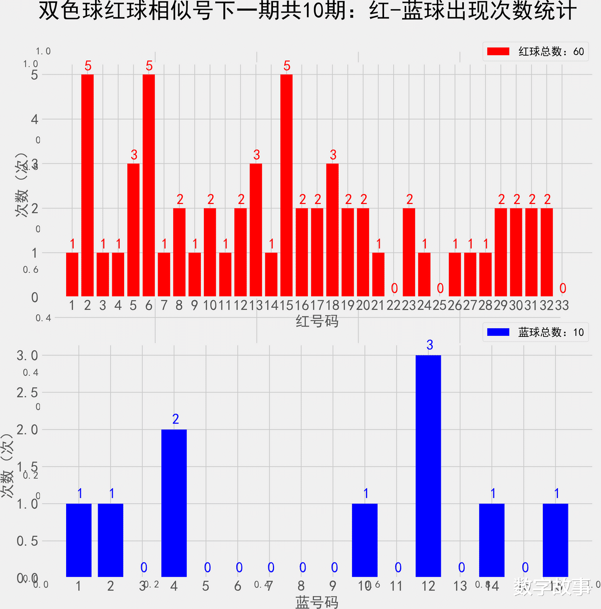 双色球近10期红蓝号统计情况统计样本数据: 60个红球 10个蓝球