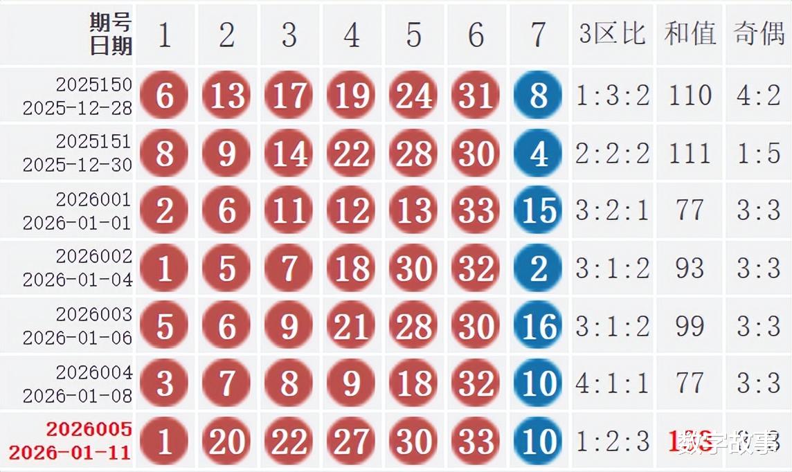 双色球26005期开奖结果及中奖情况:出奖时间: 2026-01-11 星期日 红球: 1-20-22-27-30-33蓝球: 10双色球红球隔期下落:30蓝球重号叠码:10红球奇偶比:3:3红球和值:133红球跨度:32 三区比:1:2:3没有连号