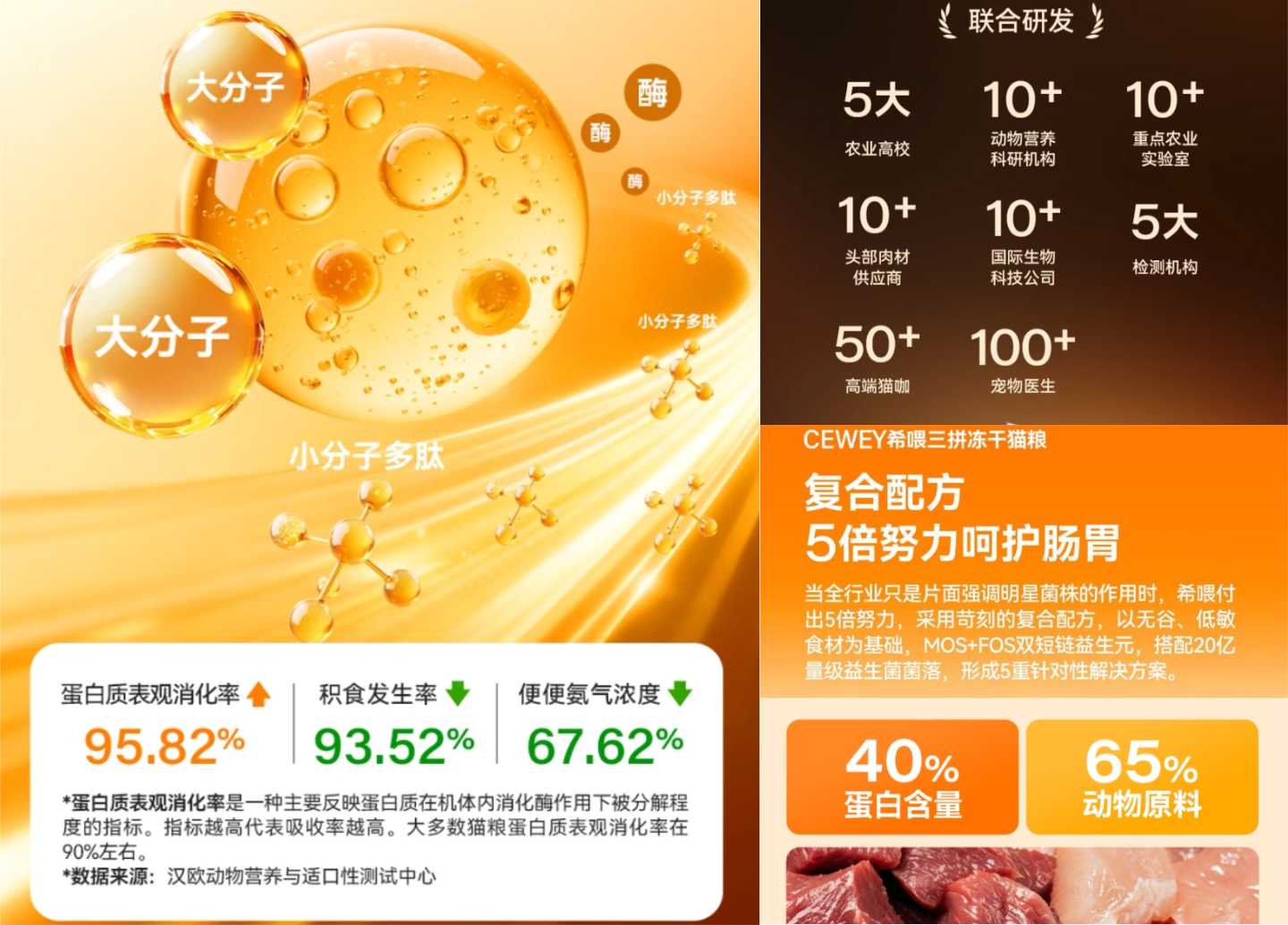 还有它的加工工艺,也值得好好夸一夸。主粮在传统加工流程的基础上多加了一步酶解处理,能把肉里的大分子蛋白提前分解成小分子多肽。这样一来,猫咪吃进去之后吸收起来更省力,消化率也会更高。2025年精选10大安全又便宜猫粮品牌希喂三拼冻干猫粮,实测数据是,粗蛋白质含量有44.57%,蛋白质表观消化率更是达到了95.82%。高蛋白加上高吸收,不仅能减轻猫咪的肠胃负担、呵护肠胃健康,还能帮猫咪有效增肌长肉。尤其适合那些体型瘦弱、营养不良,或者肠胃功能比较弱的猫咪。