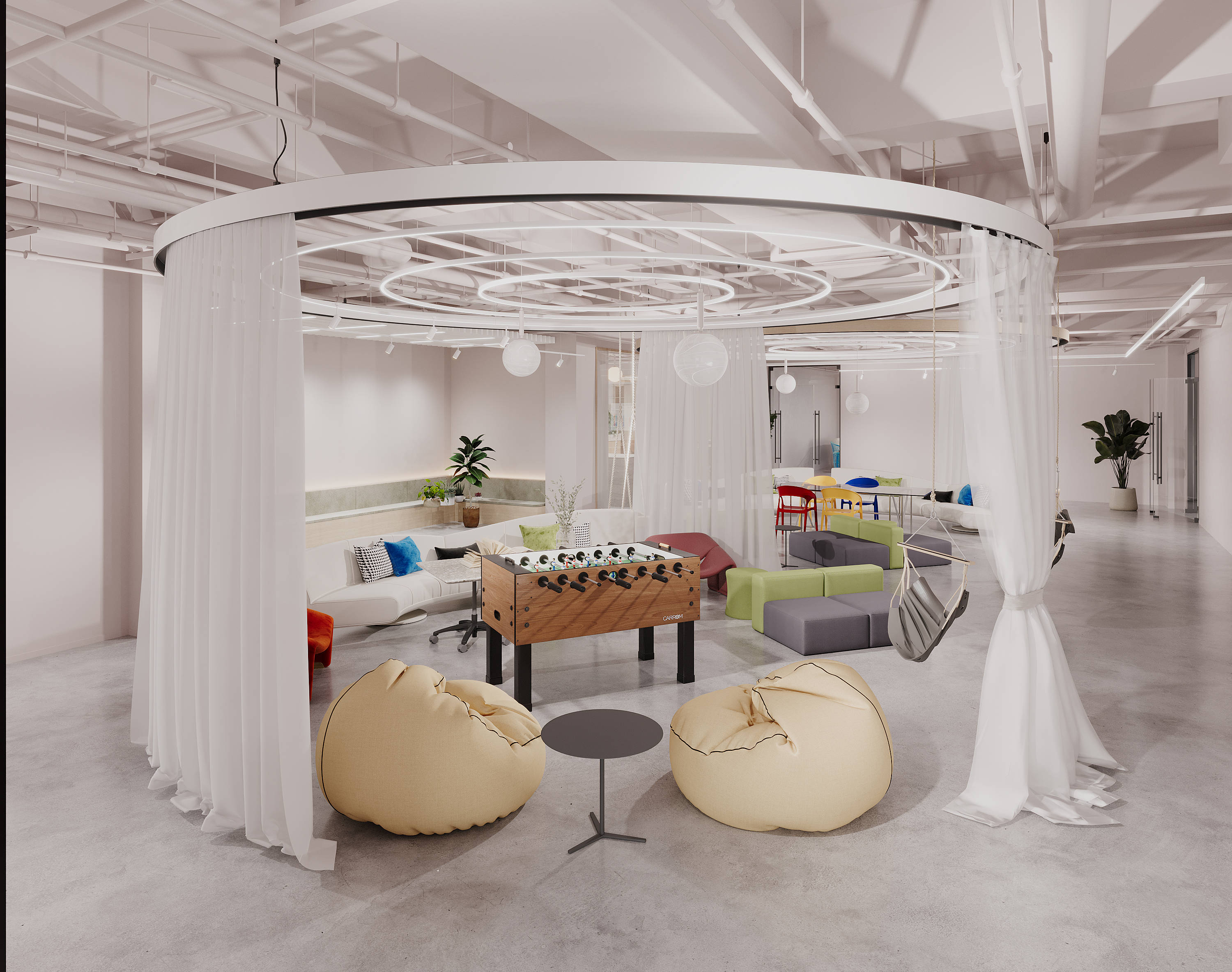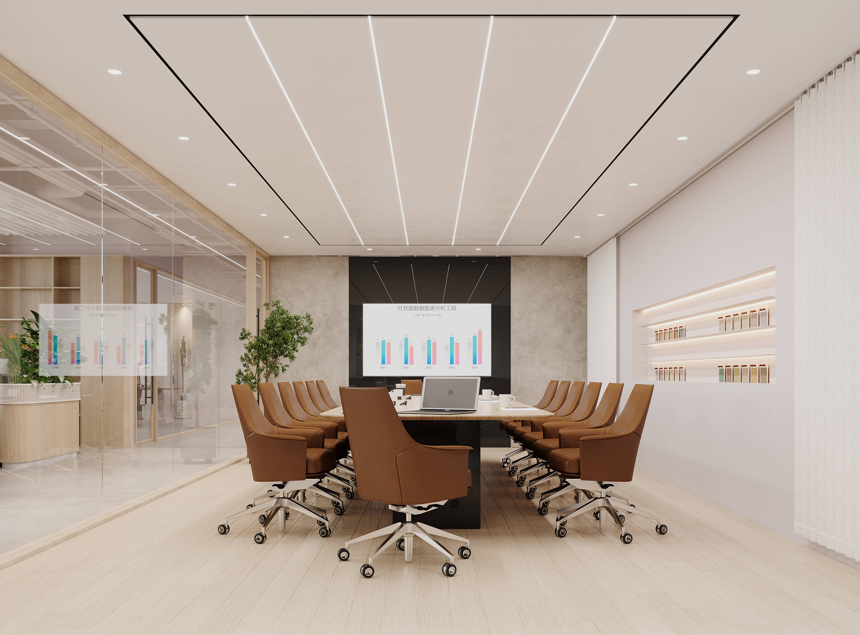 办公室通过合理的色彩运用、简洁的线条设计和巧妙的绿化布置等方式,营造出了一个温馨和谐的工作氛围。