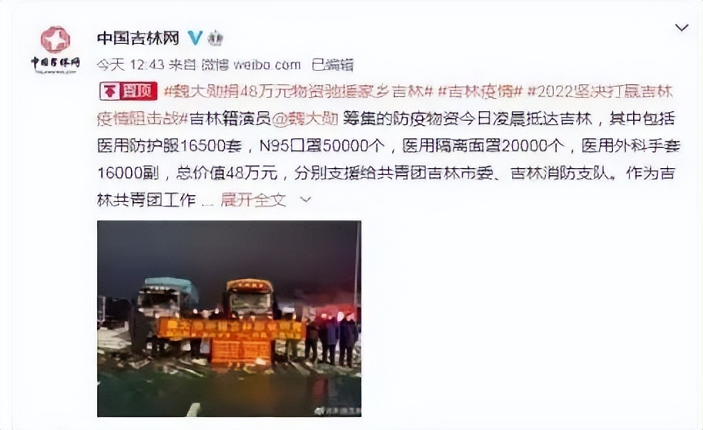 魏大勋捐款50万元,之前他还向吉林市委捐赠了大量医用防护物资,总价值达四十八万元。
