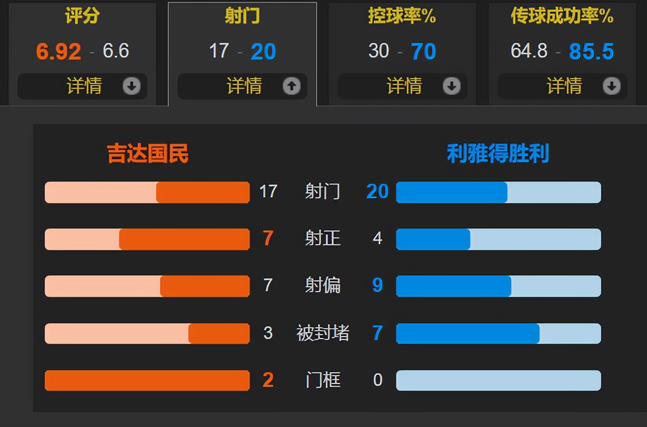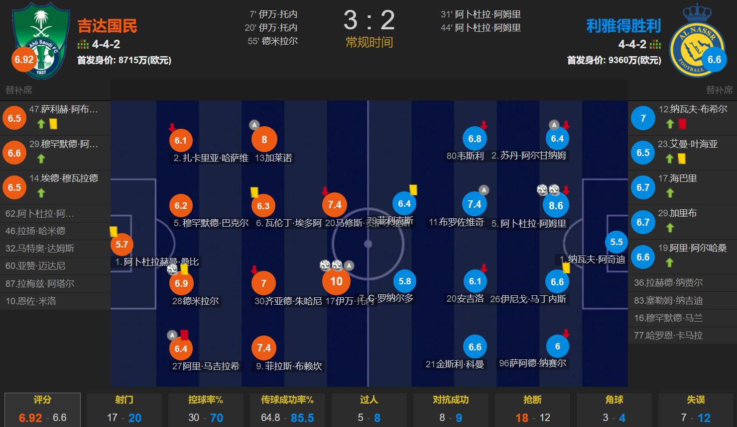 此役利雅得胜利反客为主,压制残阵吉达国民,占据高达70%的控球率,但吉达国民反击犀利。两队形成了疯狂射门的场景,利雅得胜利狂射20脚,吉达国民也获得了多达17次射门,利雅得胜利仅有4次射门,而吉达国民获得了7次射门。其中前英超铜靴伊万5射2正打入2球,外加1次助攻;再看C罗4射0正,还停球失误错失单刀,那球菲利克斯都喂到了嘴边,C罗却吐饼。