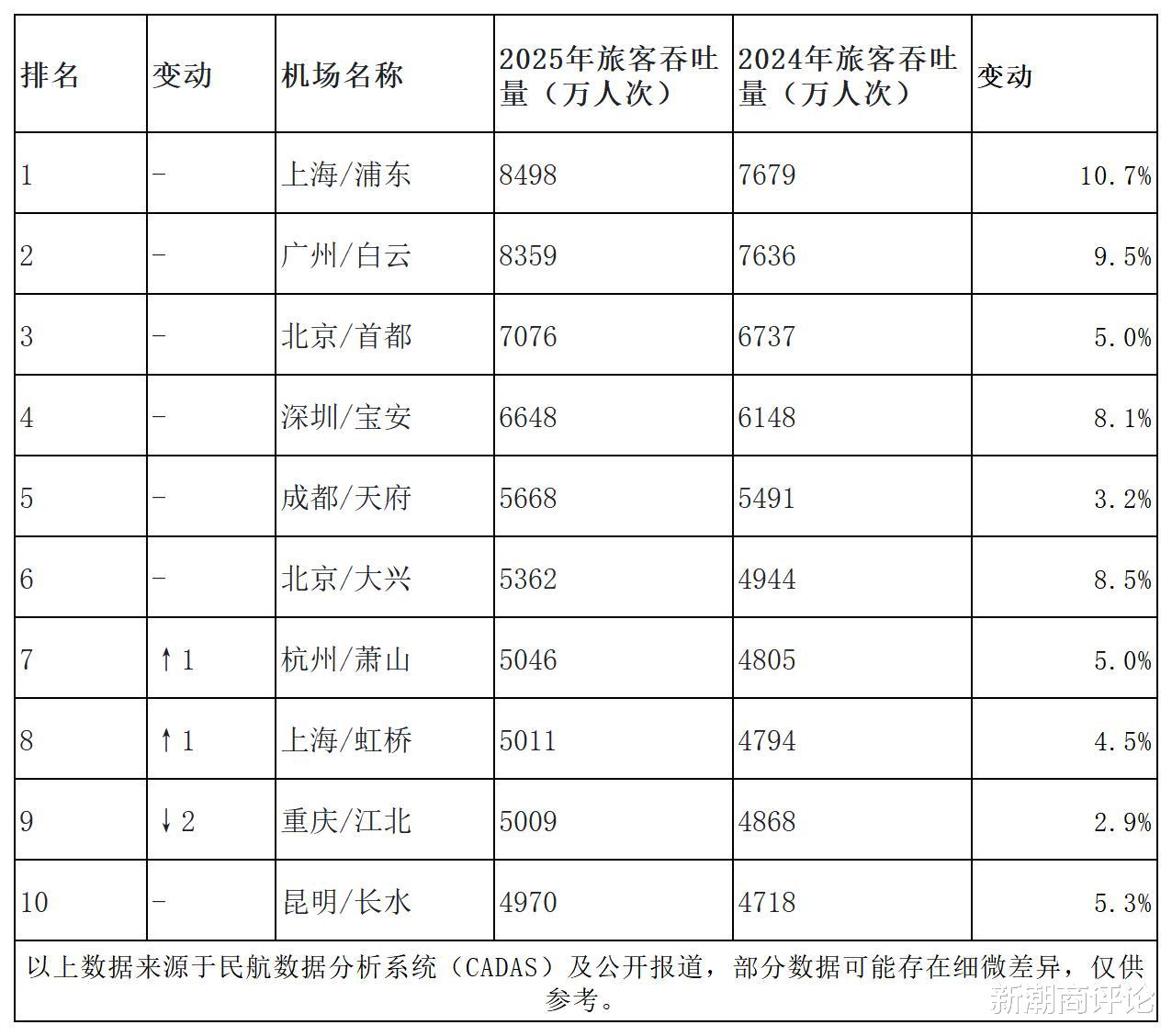 2025年中国十大机场(不含港澳台)排名发生变动。北京大兴、杭州萧山、上海虹桥、重庆江北年客流量首次突破5000万人次,至此,内地已有9个机场达成这一里程碑。