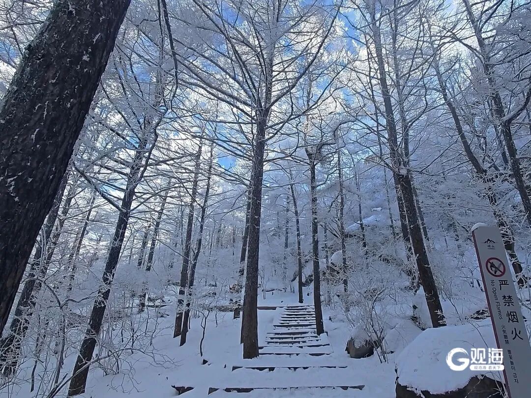 与巨峰的银装素裹形成鲜明对比的,是太清游览区的热烈与静谧。冬日暖阳下,步月廊旁的红枫如火如荼,与古观的红墙黛瓦、千年银杏的金黄落叶相映成趣,构成一幅冷暖交织的绝美画卷。漫步其间,听山风穿林、海鸥鸣唱,古观的禅意与自然的生机交融,让人忘却尘世喧嚣。待到深冬,九水游览区的冰瀑则为冬日更添几分梦幻色彩,昔日奔流的瀑布凝结成洁白的冰挂,层层叠叠如水晶帘幕,沿步道前行,仿佛步入崂山版“冰雪奇缘”。