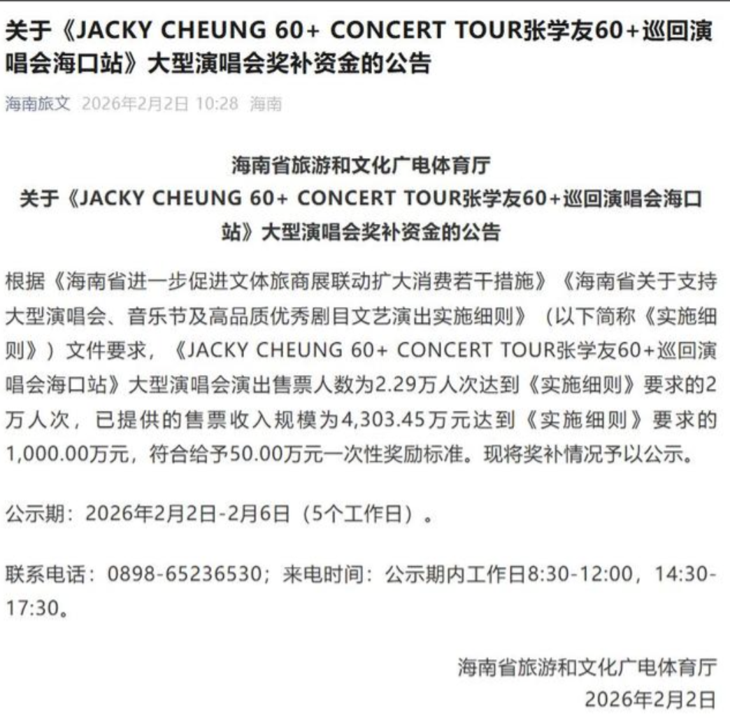 2月2日,海南省旅游和文化广电体育厅正式通报,两大天王级演唱会海口站斩获官方一次性奖励:《陈奕迅 FEAR and DREAMS世界巡回演唱会》因售票人数与票房规模双达标,获100万元奖励;《张学友60+巡回演唱会》同步符合相关标准,获50万元奖励。此次奖励依据明确的政策细则发放,既是对两场演唱会市场影响力的认可,更彰显海南推动文体旅融合、扩大消费的坚定力度,消息一出迅速引发网友热议。