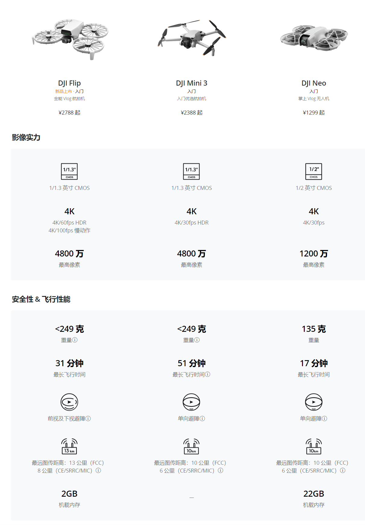 大疆Flip的重量低于249克,和大疆mini 4 Pro同级的1/1.3型相机,F1.7+三轴云台。