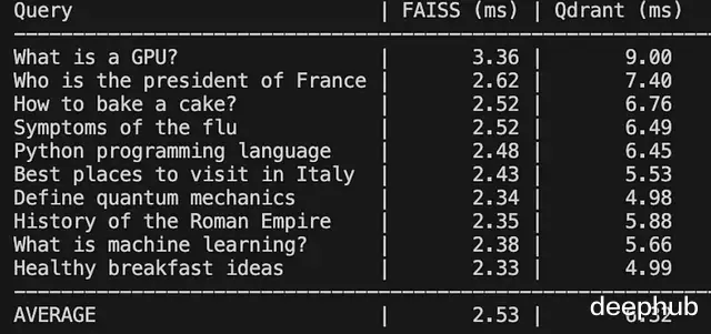 Qdrant(Docker):约 3ms,包含了网络传输的开销