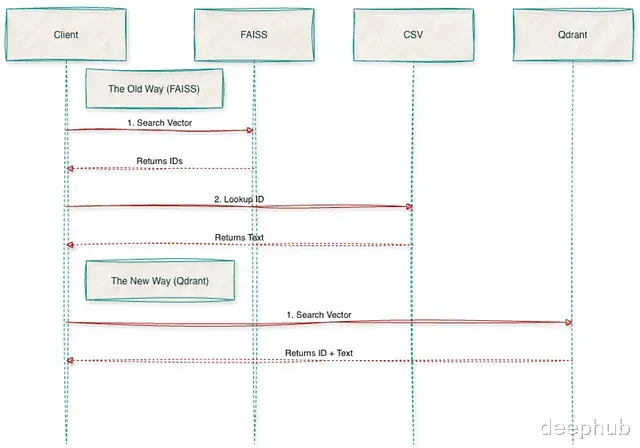 用过 FAISS 就知道为了把向量 ID 映射回文本,还需要额外维护一个 CSV 文件。迁移到 Qdrant 后这些查找逻辑都删掉了,文本和向量存在一起,直接查询 API 就能拿到完整结果,不再需要管理各种文件,就是在用一个微服务。