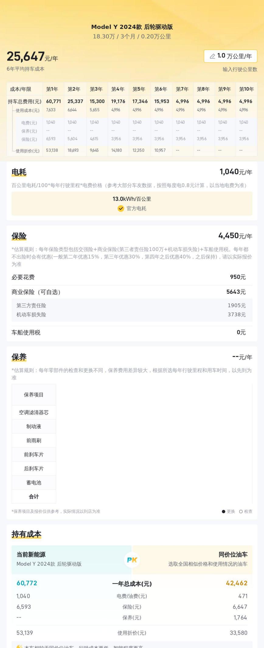 再来说说用车成本。根据数据,这辆车的10年平均用车成本约为26180元/年,其中电费仅为1932元/年,这确实比同价位的燃油车要低很多。但是,别忘了5633元/年的保险费用和3315元/年的保养费用。而且,随着电池的老化,未来的更换成本也是一笔不小的开支。