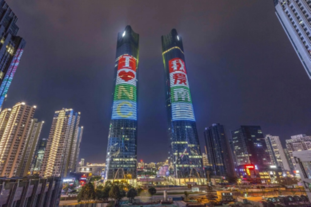 南昌绿地双子塔高303米,其LED楼体灯光秀可辐射红谷滩全城,西至丰和大道,东至滕王阁、八一大桥等核心景区。每次投放期间,品牌信息以巨幅字幕形式在夜空中滚动呈现。