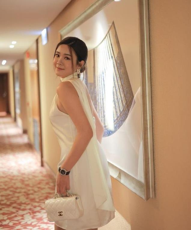 日前江嘉敏又再出招,穿上露肩短裙兼拎着白色Chanel手袋在五星级酒店的走廊留影。