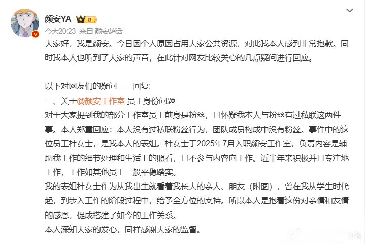 争议的焦点之一,是关于其工作室员工的身份问题。网络上曾有声音质疑,团队中存在由粉丝转化而来的成员,甚至暗示有私联行为。对此,颜安没有含糊其辞,而是直接揭开谜底:备受关注的杜姓员工,实则是看着他长大的表姐。这份基于亲情和感恩的工作关系,解释了其入职的合理性,也用无可辩驳的亲属关系证明,粉碎了无端的猜测。这份坦荡,展现了他处理危机时的真诚与透明。